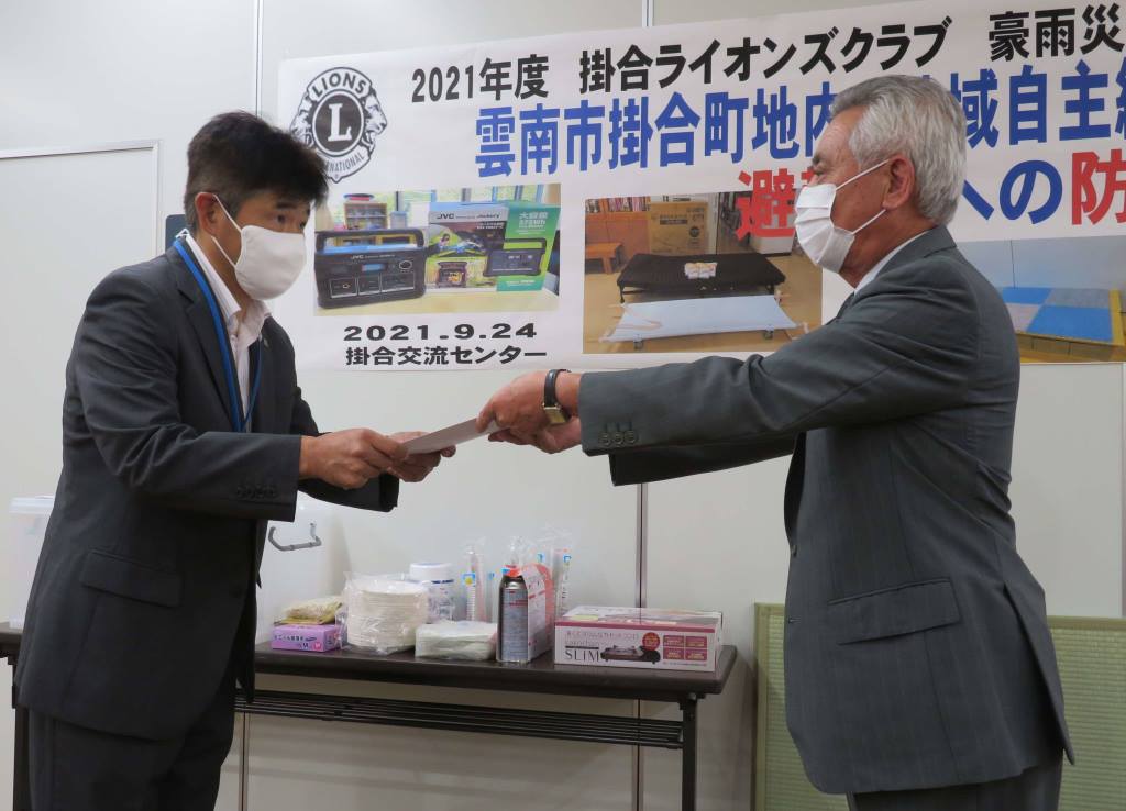 本日の記念式典は、多くのご来賓をお招きし、80数名の規模で開催する予定で、実行委員会で準備してきました、ご承知の通り新型コレラウィルス感染症が拡大の中で、実行委員会で熟慮の結果、規模を縮小し、掛合ライオンズクラブのみで開催する事とした次第でありますのでご理解を賜りたいと思います。
